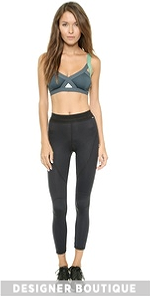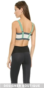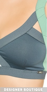 An edgy VPL sports bra with an inset and back panel of breathable mesh. Overlapping straps create cutouts above each cup. Wide adjustable elastic straps.