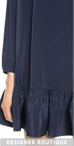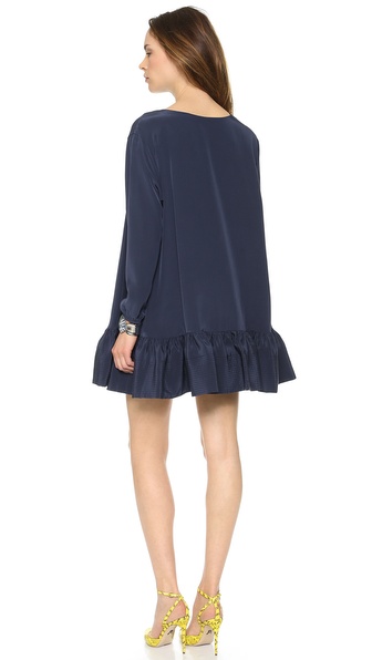 Quilting lends soft structure to the ruffled hem on this sweet Cynthia Rowley dress. Gathered elastic cuffs add volume to the long blouson sleeves. Lined.