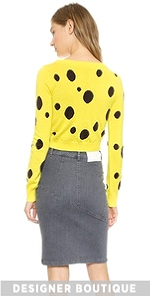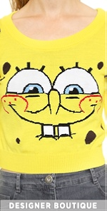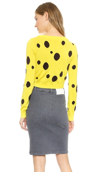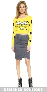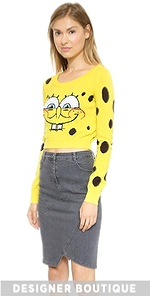 This cropped fitted Moschino sweater is detailed with an intarsia Spongebob Squarepants™ face at the front and polka dots are scattered throughout. Ribbed scoop neckline and hem. Long sleeves.