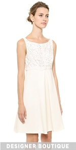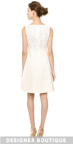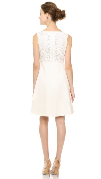 A delicate lace bodice offers tactile contrast to the sturdy mid-weight jersey skirt on a fit-and-flare J. Mendel dress. An inverted box pleat lends movement to the silhouette and a sleek boat neckline adds a romantic touch. Sleeveless. Hidden back zip. Lined.