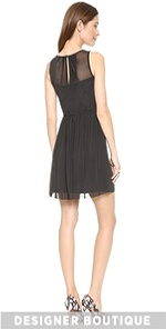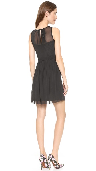 A layer of sheer mesh adds a sultry vibe to a sleeveless BB Dakota dress. Hidden elastic cinches the waist. A single button secures the back keyhole. Raw mesh hem. Lined.