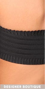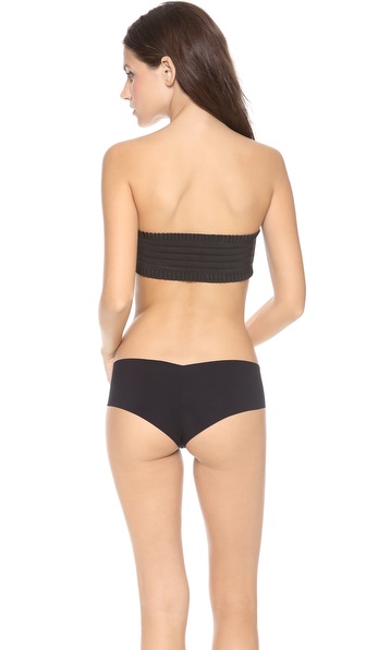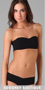 This jersey bandeau features a sweetheart neckline and a ruffled elastic back panel. Boning at sides. Covered elastic banding at top and bottom hems. Lined at front.