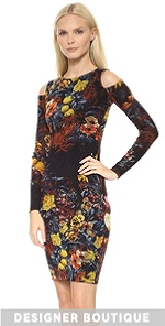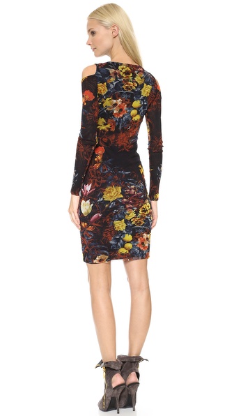 A vivid gothic floral pattern plays across this slinky mesh Jean Paul Gaultier sheath dress and shoulder cutouts offer an edgy peek of skin. Crew neckline. Long sleeves. Double-layered.