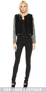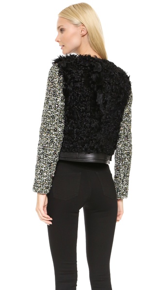 A cropped Leur Logette jacket makes a tactile impression in curly shearling and colorful tweed. Patent appliqué flowers detail the long sleeves and hook-and-eye closures secure the placket. Domed rhinestone buttons detail the belted leather waistband. Lined.
