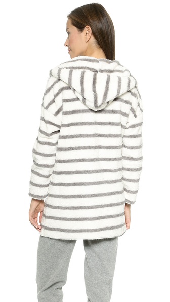 A striped PJ Salvage robe cut from super-soft fleece. Patch pockets frame the button placket. A hood adds cosy versatility. Long sleeves.