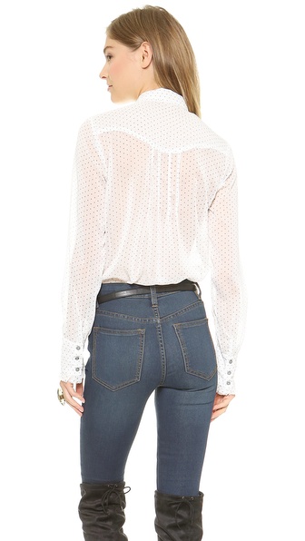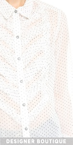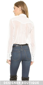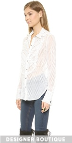 This summery Free People blouse gains an airy drape from a wide high-low hem. Ruffles frame the button placket adding feminine charm to the silhouette. Delicate pintucks detail the back. Button cuffs and long sleeves.