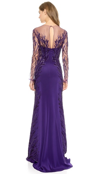 Glittering tonal beads create striking stripe patterns along the sides and sleeves of this daring Reem Acra gown. Nude silk lines the sheer mesh panels through the sides and the illusion sweetheart neckline adds an elegant feel. The slim skirt flares into a gently trailing hem. Hook-and-eye keyhole and hidden zip at back. Sheer long sleeves. Lined.