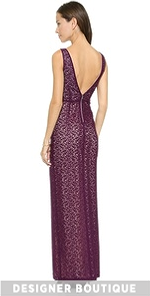 A long notched slit reveals an alluring peek of skin on a formfitting stretch-lace alice olivia dress. The sophisticated silhouette is styled with a scoop neckline that angles into a deep V back and contrast lining accentuates the patterned overlay. Exposed back zip.
