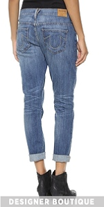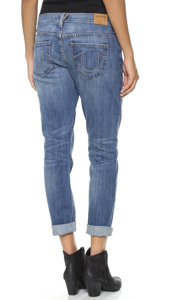 These True Religion boyfriend jeans in a slouchy relaxed profile. Decorative stitching details the patch back pockets. 5-pocket styling. Single-button closure and zip fly.