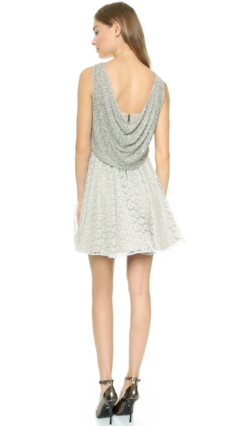 Iridescent sequins shimmer over delicate mesh on a romantic alice olivia dress styled with a draped overlay bodice. Metallic threads accent the lace skirt and structured lining adds movement to the silhouette. Exposed back zip. Adjustable straps. Lined.