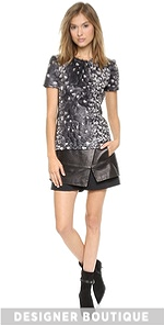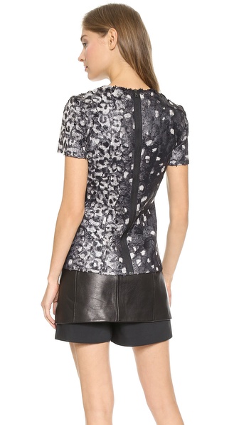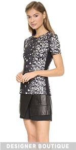 A light glossy coating creates slick texture on a patterned faux-fur BCBGMAXAZRIA top. Inset jersey panels accent the sides lending a close fit to the avant-garde piece. Exposed back zip. Short sleeves.