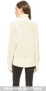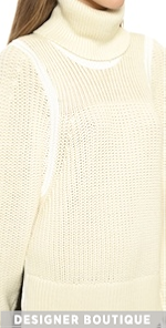 A modern Helmut Lang pullover in a chunky knit with contrast ribbing. A dramatic split hem eases the fit. Ribbed edges and fold-over turtleneck. Long sleeves.