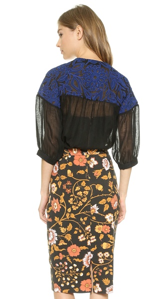 Ruching ripples across the floral yoke of an airy gauze SUNO blouse. Banded cuffs gather the 3/4 blouson sleeves and a silky tie secures the keyhole closure. Semi-sheer.