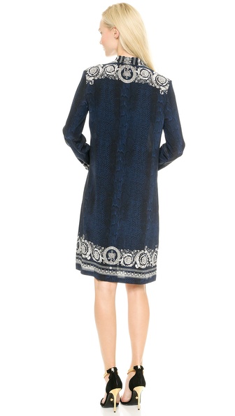 This silk Versace shirtdress balances edgy snake-print with classic paisley. An attached scarf ties at the V neckline and polished buttons secure the placket. Long sleeves. Unlined.