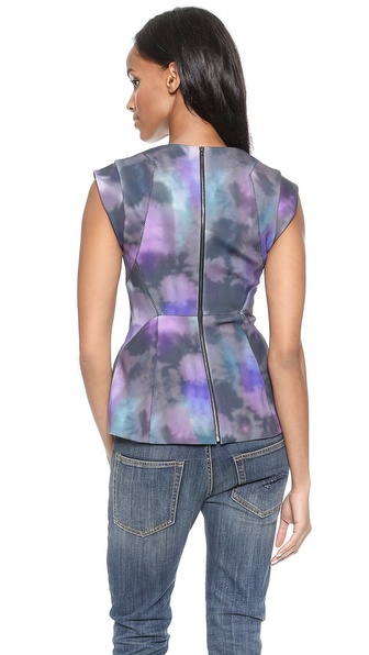Hazy colors lend rich depth to a futuristic neoprene Rebecca Taylor top. Topstitching accentuates the paneled construction and solid trim accents the deep V neckline. Exposed back zip. Lined.
